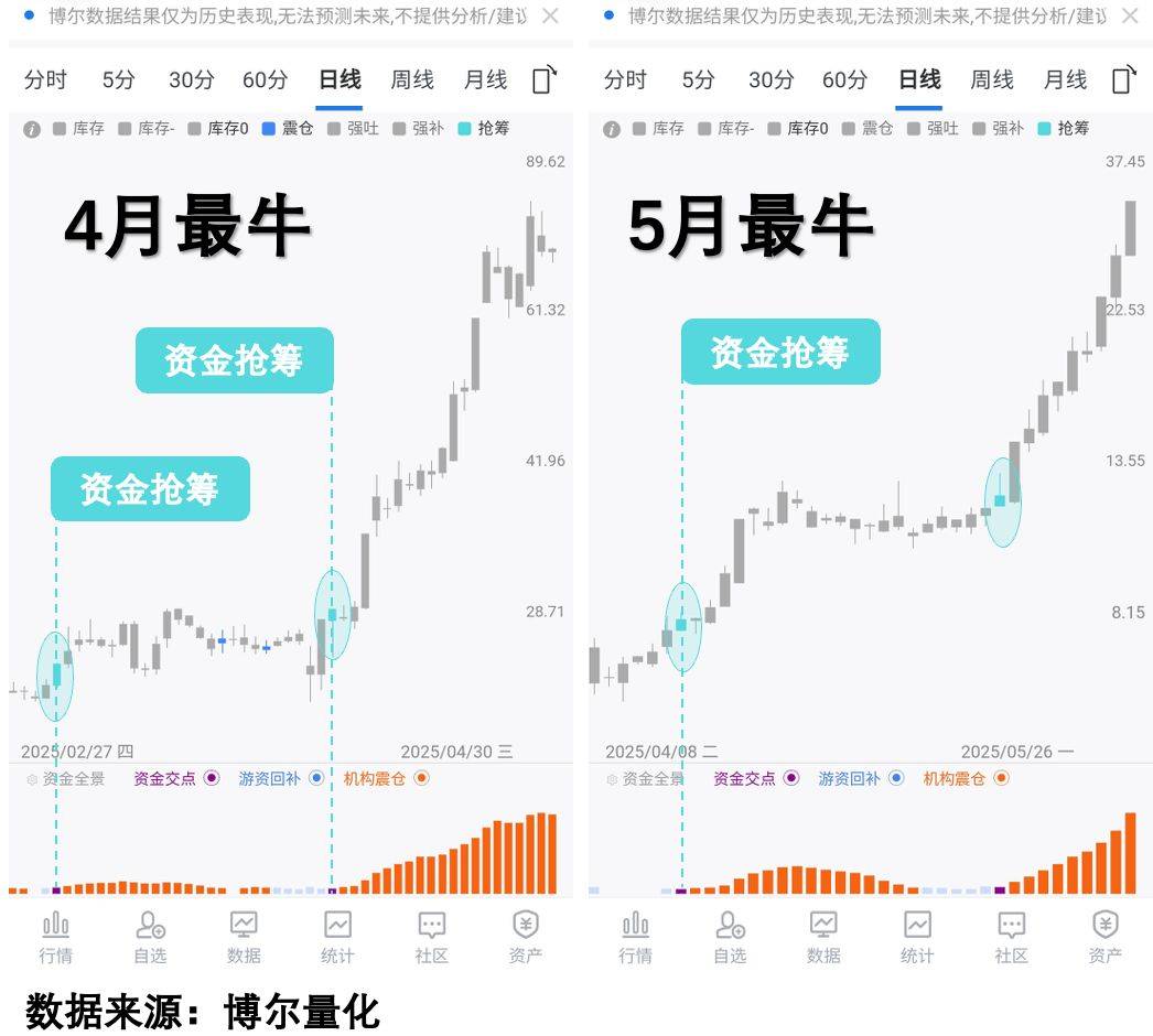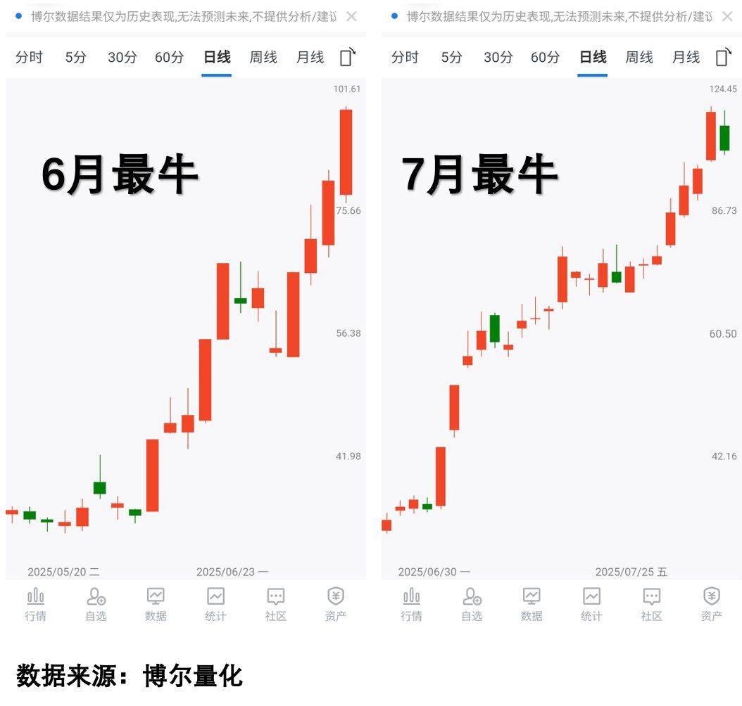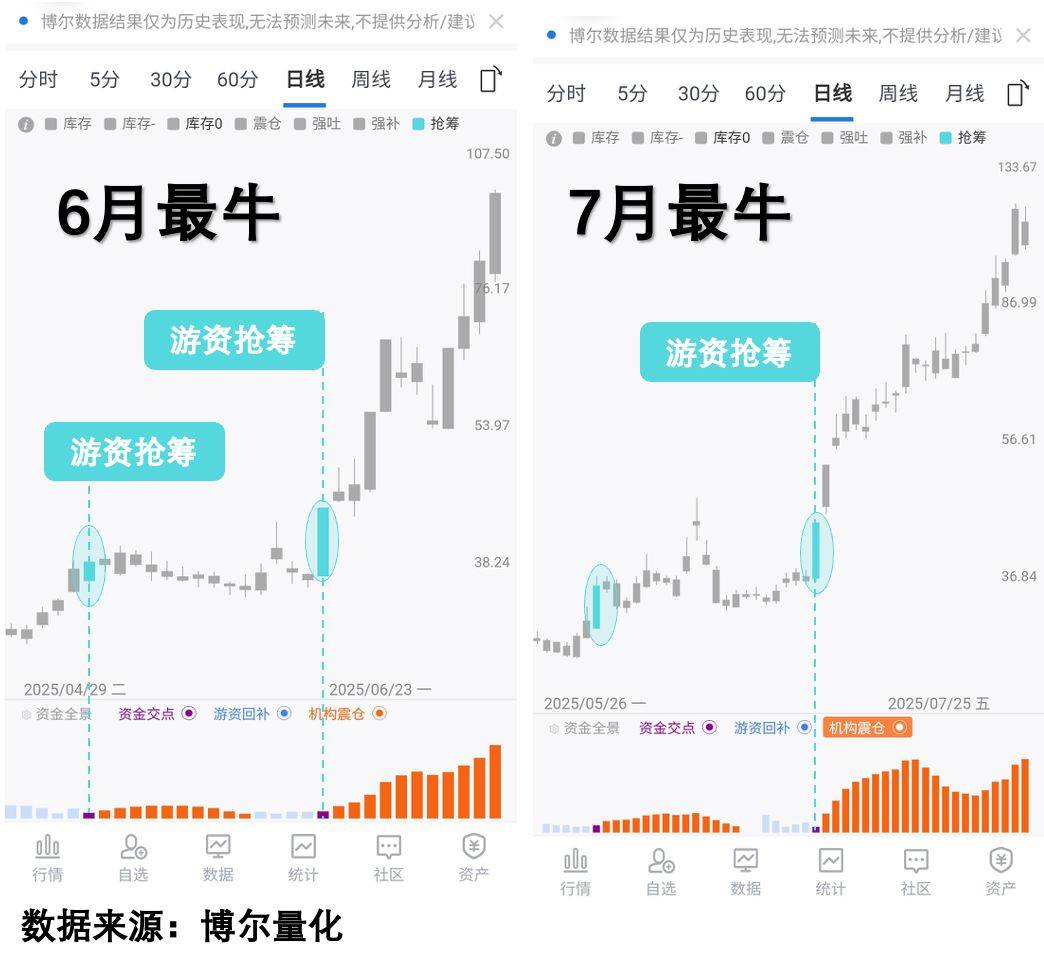 我们以2025年二季度开始的这波行情为例,把其中4月、5月、6月和7月四个月的涨幅居前的股票给列出来,来看看其中的区别,下面四个股票,是除去重组消息之外2025年4月到7月期间表现最好的4个股票,不难发现,看上去涨之前毫无征兆,涨的时候很多都是连续涨停,搞不清楚情况根本不敢介入,也担心介入之后万一追高怎么办,结果就是哪怕回头看有无数的介入时机,也只能作壁上观。