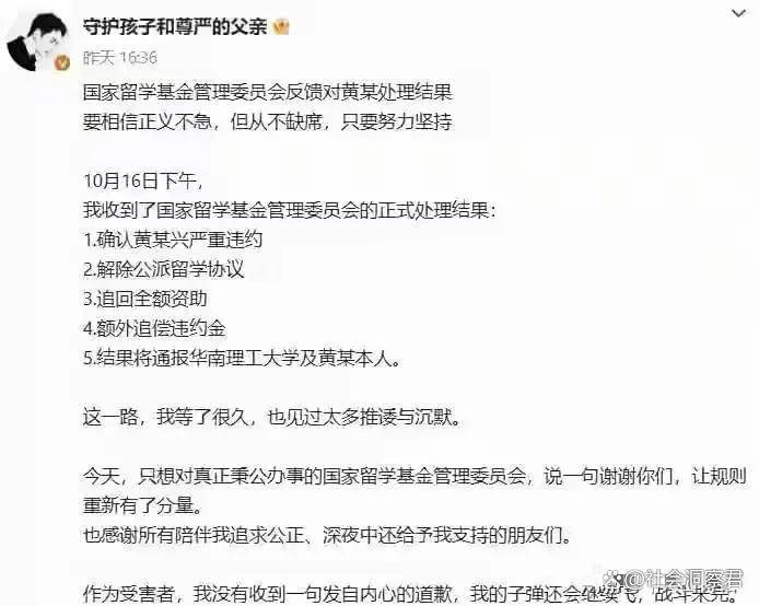 随着舆论的发酵,9月25日,华南理工大学率先给出了处理结果:对黄某兴处以“留校察看”。但这个结果和张先生“取消黄某兴博士学位”的诉求相差甚远,不少网友质疑“处罚太轻”。直到10月17日,国家留学基金管理委员会的处理结果公布,事情才有了新的进展:确认黄某兴严重违约,解除公派留学协议,追回全额资助费用,还要求其额外支付违约金,结果也同步通报给了华南理工大学。