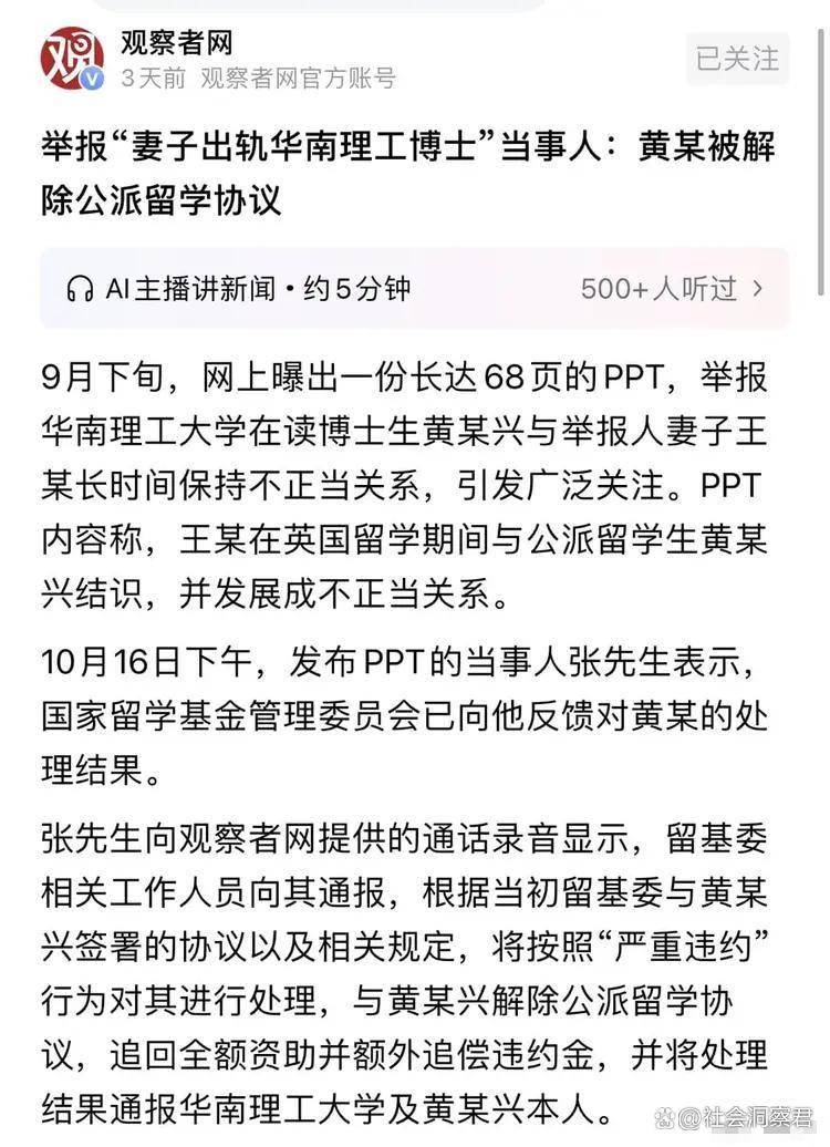 据媒体报道,9月下旬,网上曝出一份长达68页的PPT,举报华南理工大学在读博士生黄某兴与举报子王某长时间保持不正当关系,引发广泛关注。PPT内容称,王某在英国留学期间与公派留学生黄某兴结识,并发展成不正当关系。