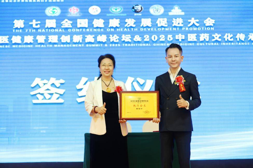 深圳市健康管理研究会齐云芳会长,为精英AI商业集团董事长黄智中,授牌为深圳市健康管理研究会执行会长,双方将在中医健康智能化领域展开深度合作。