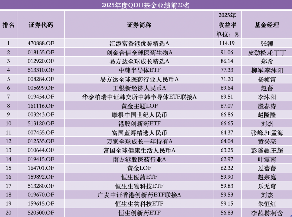 此外,创金合信全球医药生物A、易方达全球成长精选A紧随其后,2025年收益率依次为91.06%、86.14%,位居第二名、第三名。