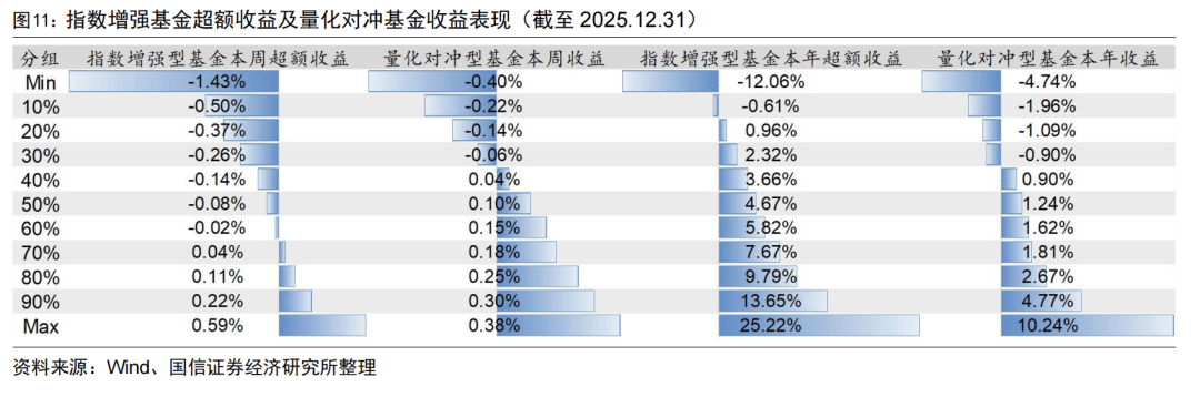 上周指数增强基金超额收益中位数为-0.08%,量化对冲型基金收益中位数为0.10%。今年以来,指数增强基金超额中位数为4.67%,量化对冲型基金收益中位数为1.24%。