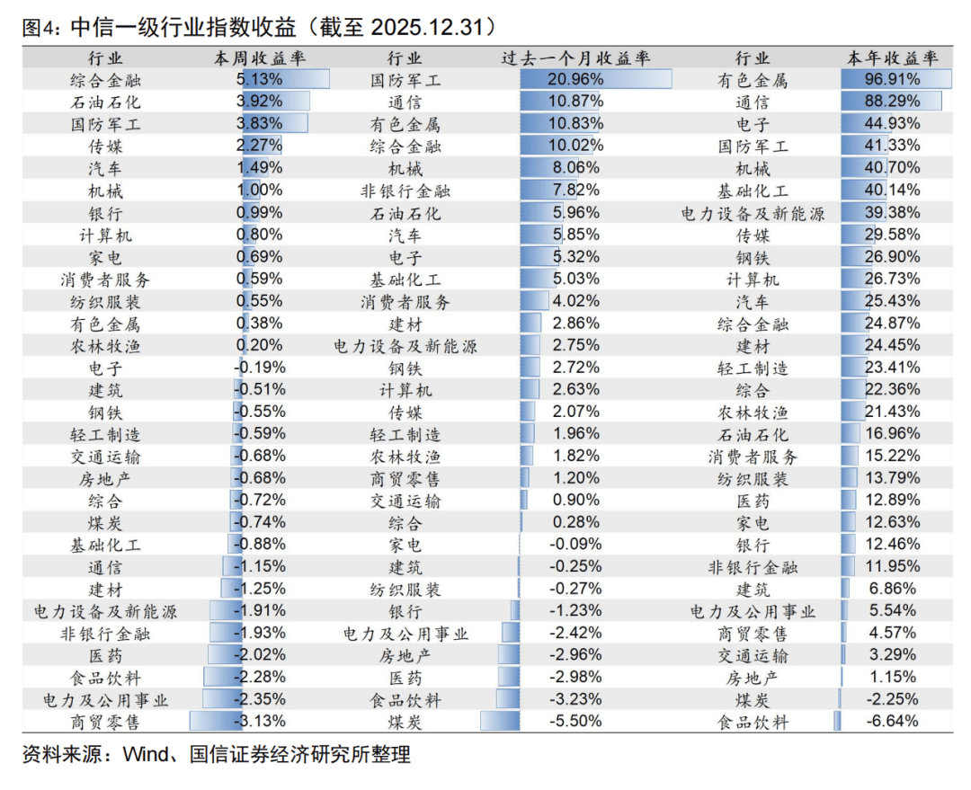 行业方面,上周综合金融、石油石化、国防军工收益靠前,收益分别为5.13%、3.92%、3.83%,商贸零售、电力及公用事业、食品饮料收益靠后,收益分别为-3.13%、-2.35%、-2.28%。过去一个月,国防军工行业累计上涨20.96%,收益最高,煤炭行业累计下跌5.50%,收益最低。今年以来,有色金属、通信、电子的累计收益较高,分别为96.91%、88.29%、44.93%,相比之下,食品饮料、煤炭、房地产等多个行业的收益率最低。