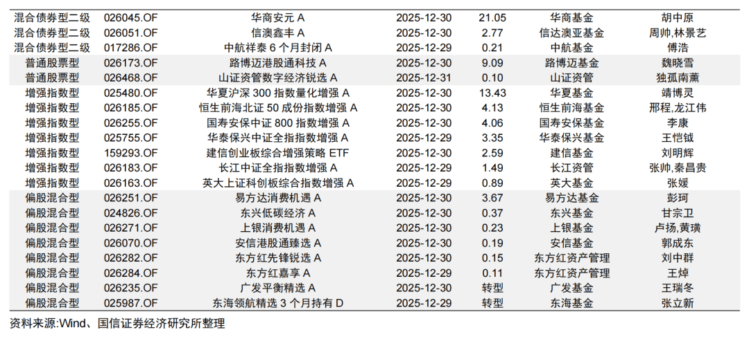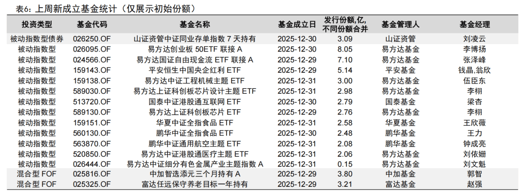 上周新成立基金35只,新发基金中数量较多的类型为被动指数型(12只)和偏股混合型(8只),发行规模分别为41.16亿元和4.73亿元。