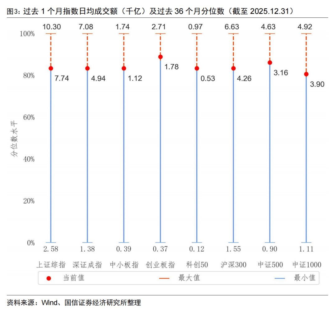 按月度来看,过去一个月主要宽基指数的日均成交额均有所上升,主要宽基指数均位于过去36个月80%-90%的历史分位水平。