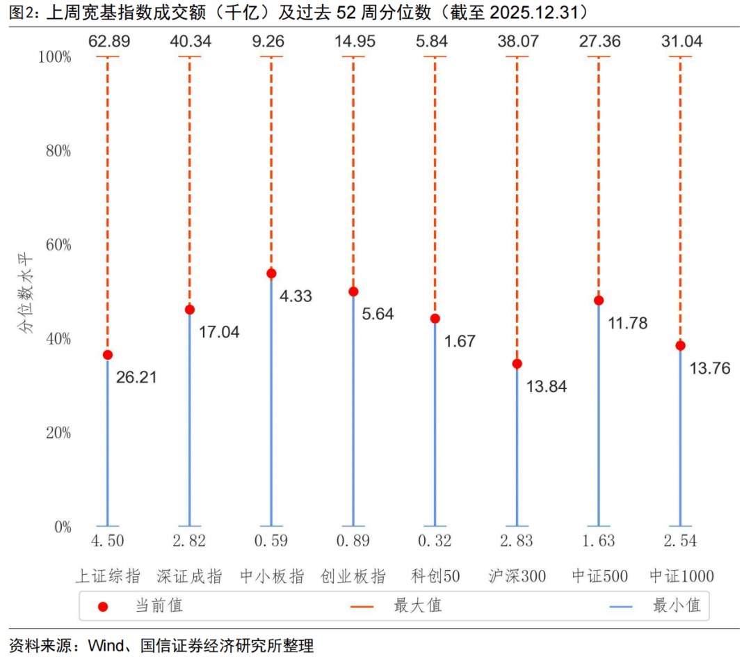 从成交额来看,上周主要宽基指数成交额均有所下降,在过去52周的样本期内,主要宽基指数均位于30%-55%的历史分位水平。