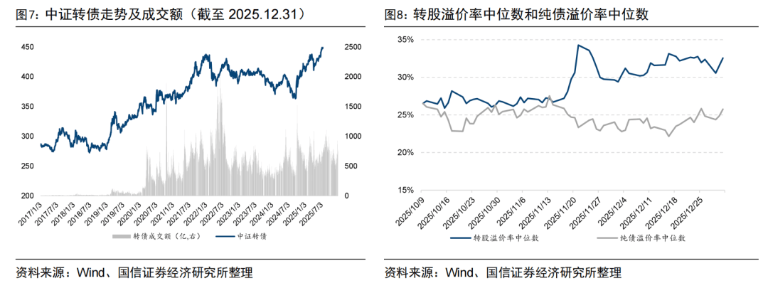 上周中证转债指数下降0.27%,累计成交2271亿元,较前一周减少1657亿元。截至上周五,可转债市场转股溢价率中位数为32.55%,较前一周增加0.18%,纯债溢价率中位数为25.76%,较前一周增加0.93%。