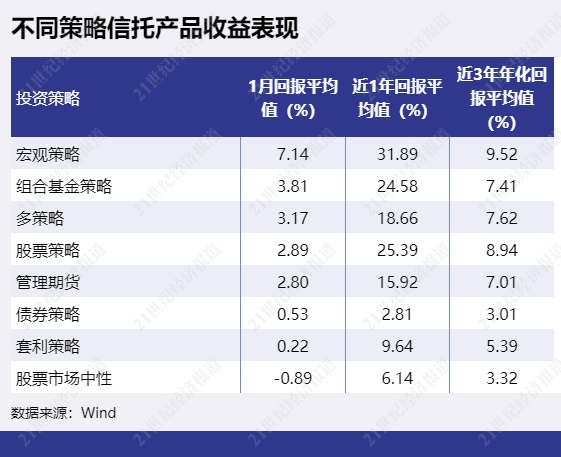 从不同策略信托产品收益表现来看,去年表现不错的宏观策略今年1月收益继续领先,1月平均回报为7.14%。组合基金策略表现也不俗,1月平均回报为3.81%。多策略1月平均回报3.17%排第三。