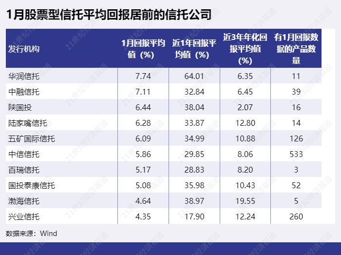 股票型信托方面,以华润信托发行的股票型信托1月平均回报最高,华润信托去年股票型信托收益排名也靠前。中融信托排第二,1月平均回报为7.11%,陕国投排第三,1月平均回报为6.44%。