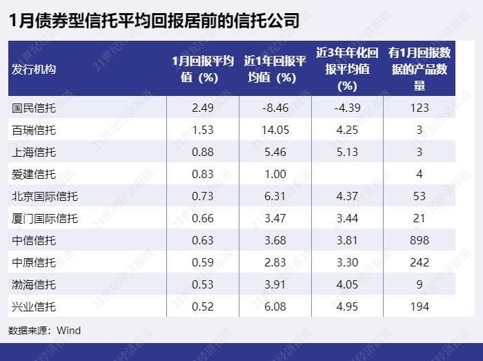 金谷信托、华鑫信托、国投泰康信托等信托公司的债券型信托1月平均回报排名靠后。