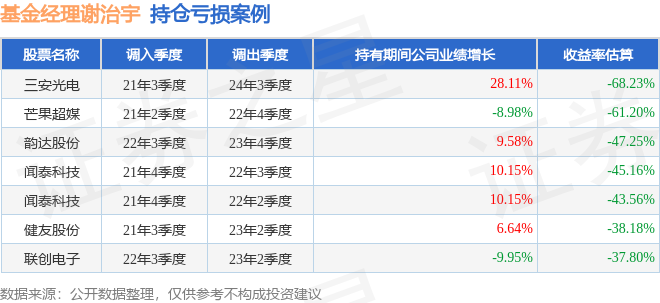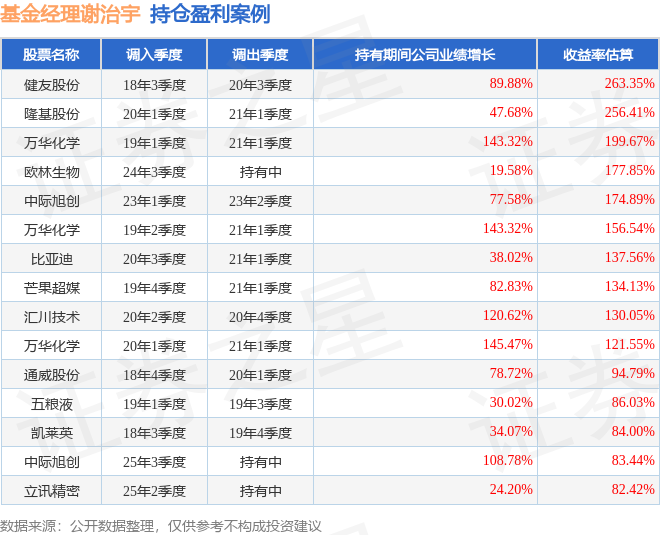 重仓股调仓示例详解: 1、健友股份(603707)翻倍案例: 谢治宇管理的兴全合润LOF基金在18年3季度买入健友股份,在持有2年又0个季度后在20年3季度卖出。持有期间的估算收益率为263.35%,持有期间健友股份在2018年到2020年的年报归属净利润增幅达89.88%。 2、通威股份(600438)调仓案例: 谢治宇管理的兴全合润LOF基金在18年4季度买入通威股份,在持有1年又1个季度后在20年1季度卖出。持有期间的估算收益率为94.79%,持有期间通威股份在2018年到2020年的年报归属净利润增幅达78.72%。 3、三安光电(600703)折戟案例: 谢治宇管理的兴全社会价值三年持有混合基金在21年3季度买入三安光电,在持有3年又0个季度后在24年3季度卖出。持有期间的估算收益率为-68.23%,持有期间三安光电在2021年到2024年的年报营业总收入增幅达28.11%。