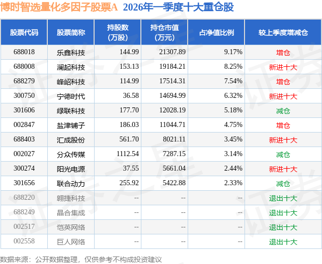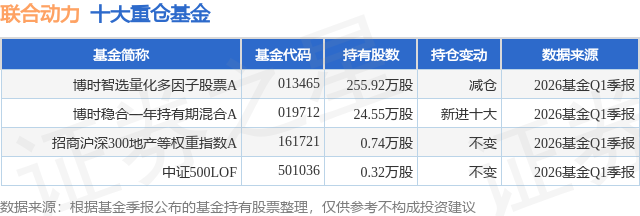 根据2026基金Q1季报公募基金重仓股数据,重仓该股的公募基金共4家,其中持有数量最多的公募基金为博时基金的博时智选量化多因子股票A。博时智选量化多因子股票A目前规模为7.77亿元,最新净值1.2395(4月27日),较上一交易日上涨1.62%,近一年上涨45.76%。该公募基金现任基金经理为刘钊。刘钊在任的基金产品包括:博时中证500指数增强A,管理时间为2020年12月23日至今,期间收益率为38.24%;500增强ETF博时,管理时间为2023年2月13日至今,期间收益率为59.7%;博时ESG量化选股混合A,管理时间为2023年3月31日至今,期间收益率为54.06%。