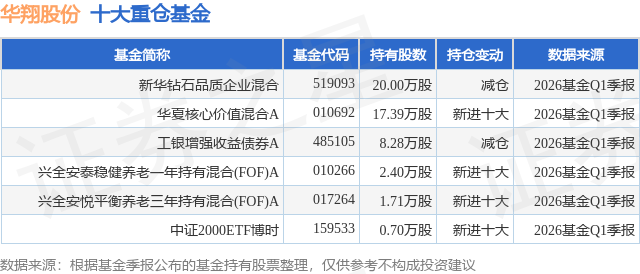 根据2026基金Q1季报公募基金重仓股数据,重仓该股的公募基金共6家,其中持有数量最多的公募基金为新华基金的新华钻石品质企业混合。新华钻石品质企业混合目前规模为1.21亿元,最新净值3.1521(4月21日),较上一交易日下跌0.05%,近一年上涨23.39%。该公募基金现任基金经理为蔡春红。蔡春红在任的基金产品包括:新华优选消费混合,管理时间为2021年9月3日至今,期间收益率为-16.78%;新华鑫动力灵活配置混合A,管理时间为2025年4月29日至今,期间收益率为70.53%。