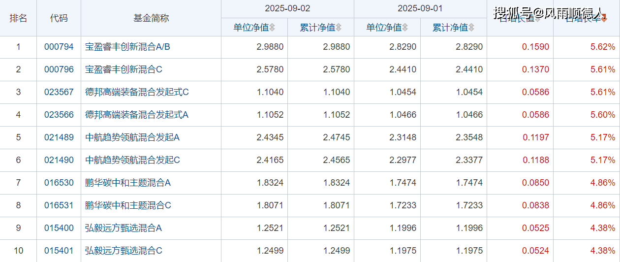 2日开放式基金净值增长排名前10的基金分别是:宝盈睿丰创新混合A/B、宝盈睿丰创新混合C、德邦高端装备混合发起式C、德邦高端装备混合发起式A、中航趋势领航混合发起A、中航趋势领航混合发起C、鹏华碳中和主题混合A、鹏华碳中和主题混合C、弘毅远方甄选混合A、弘毅远方甄选混合C。