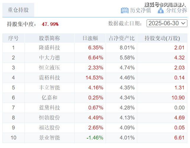 该基金十大持仓中长电科技跌幅较大,前十持仓占总持仓的40.09%,按这个持仓结构今天应该只是小跌而已,近期这个基金波动也比较大,符合这种波动的估计是风格转换至人工智能板块上,刚刚今天就有回调导致净值回撤很大,基金风格原属于大消费行业,但目前明显不是这个风格,基金净值相对跑输市场(属于已调仓的主动型混合基金,按其它风格明显的基金排序,当下这个基金我猜应该转成人工智能CPO方向了)【基金规模0.09亿元】。