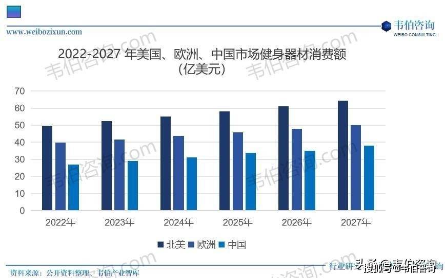 美国、欧洲健身产业起步较早,健身器材消费市场规模处于全球领先地位。健身是欧美国家尤其美国的硬核需求。2022年北美市场健身器材消费额为49.43亿美元,欧洲市场健身器材消费额为39.9亿美元,中国市场健身器材消费额为27.1亿美元。预计2027年北美、欧洲、中国市场健身器材消费额将分别达到64.39亿美元、49.88亿美元以及37.91亿美元。